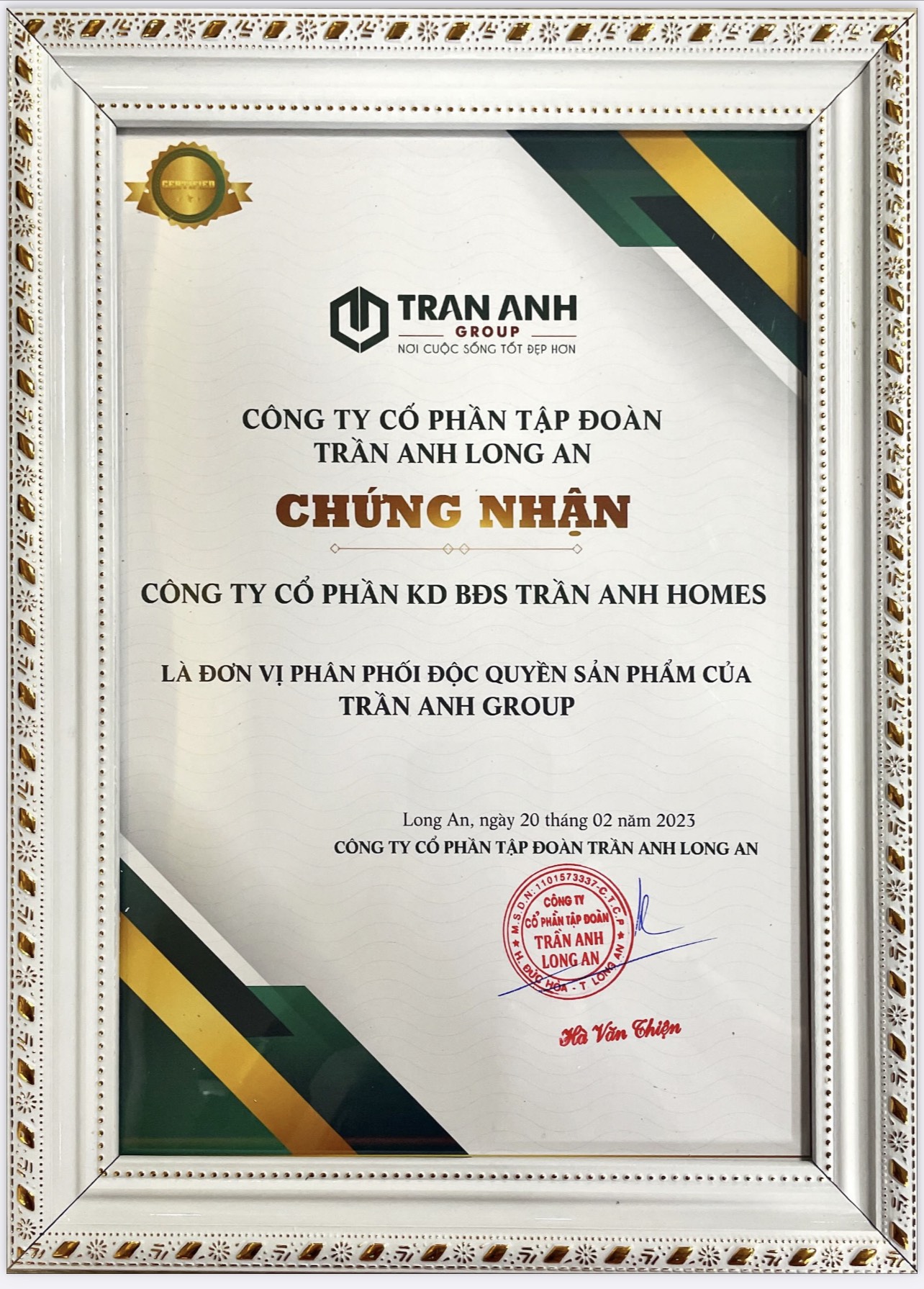 Giấy chứng nhận Công ty Trần Anh Homes là đơn vị phân phối độc quyền của Tập đoàn Trần Anh Group